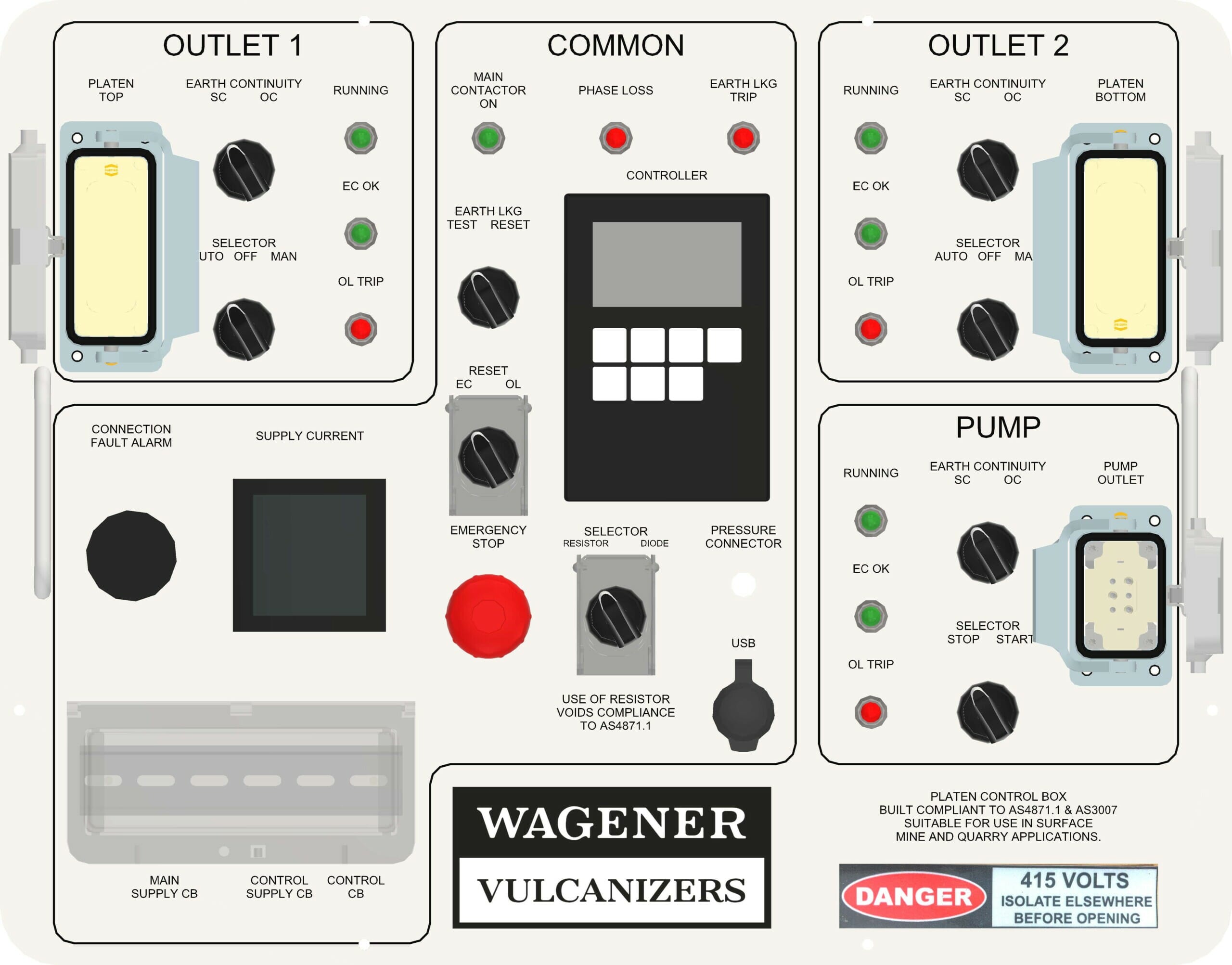 WAGENER AUS STD SPLICE WATCH Vulcanizer Control Box with Ground Fault monitoring complete with diode and resistor flexibility and pressure pump functionality.