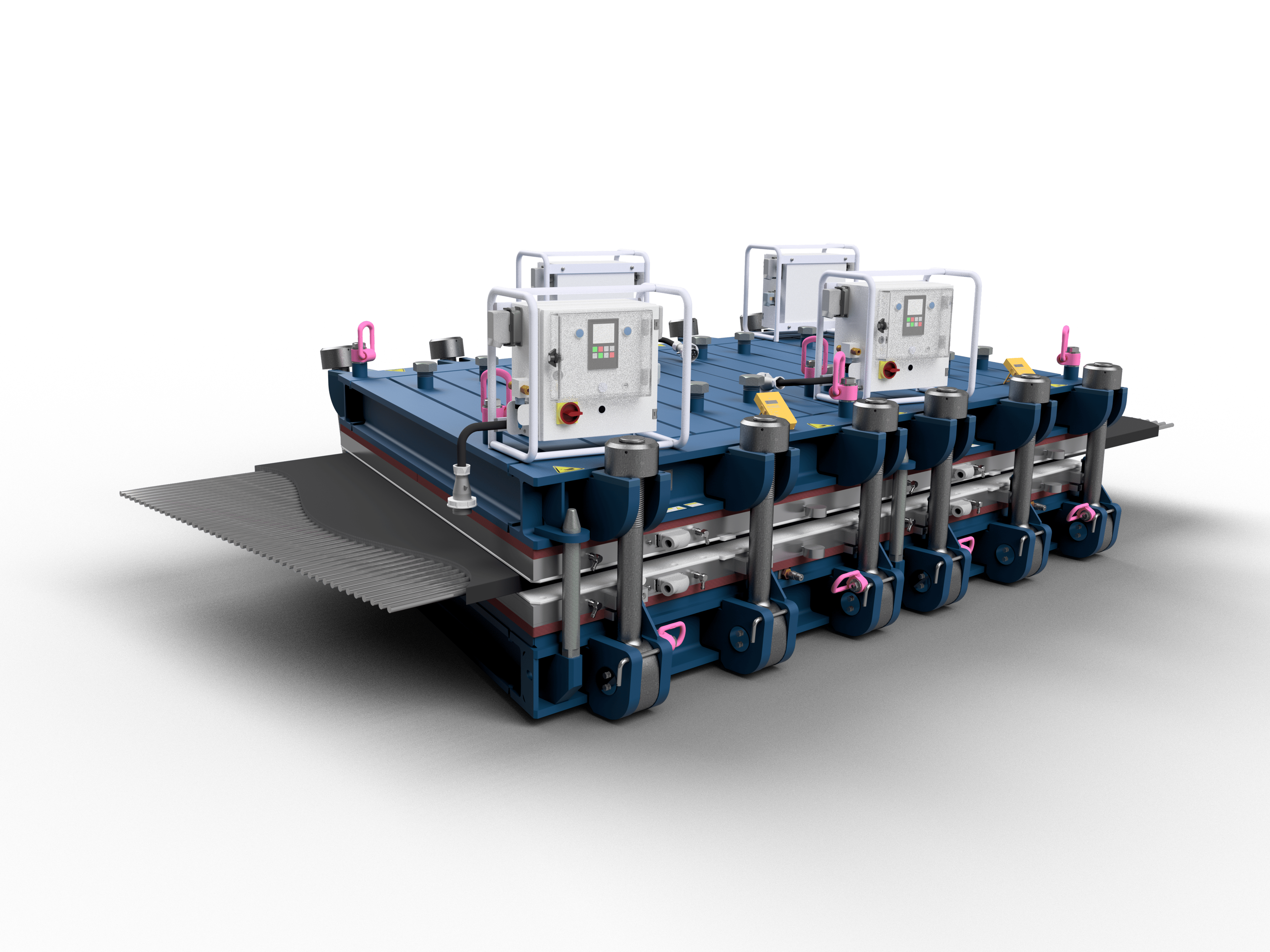 The WAGENER Vulcoframe is a heavy duty two-piece vulcanizer with separate electrical control suitable for belt widths from 1600mm to 2800mm using a maximum pressure of 200Psi on a bias of 22°.