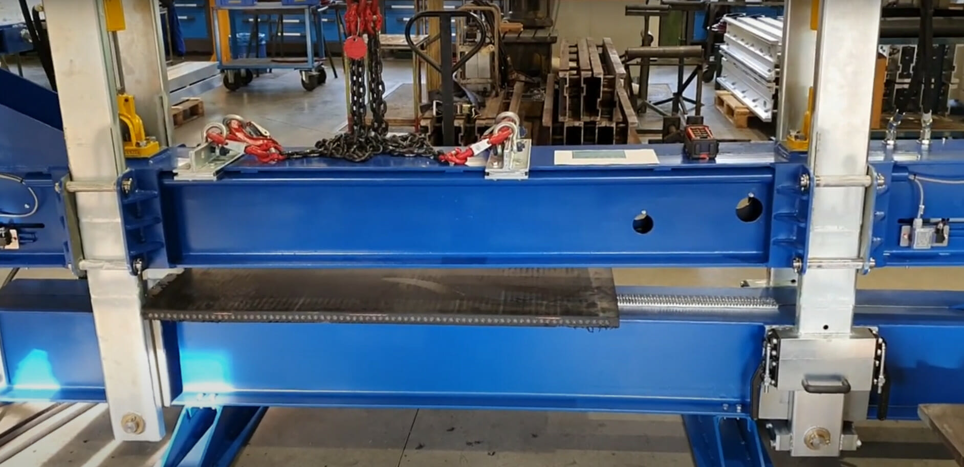 The WACOCUT is intended for stationary and mobile use. In case of stationary use, the belt clamping frame is opened parallel and the conveyor belt is pulled into the belt clamping frame. In case of mobile use, the belt clamping frame is suspended from the crane and opened scissor-like and moved into the belt conveyor.